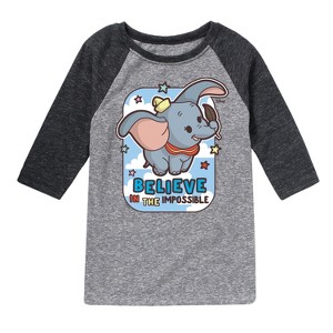 Disney - Dumbo - Believe In The Impossible - Toddler & Youth Raglan Graphic T-Shirt - Add a touch of magic to your wardrobe with this graphic apparel featuring iconic Disney designs. Showcasing beloved characters and classic imagery, each piece combines nostalgic charm with modern style—perfect for Disney fans of all ages. Whether you're headed to the parks or just adding whimsy to your everyday look, these graphics bring the magic to life.