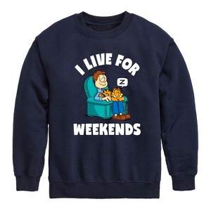 Garfield - I Live For Weekends - Toddler And Youth Crewneck Fleece Sweatshirt - Bring the humor and laziness of the famous orange cat to your wardrobe with Garfield graphic apparel. Featuring Garfield, Odie, and Jon, these designs celebrate the iconic comic strip and its beloved characters.