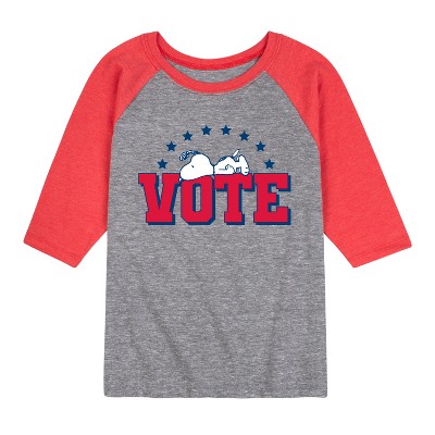 Peanuts - Snoopy Go Vote - Toddler & Youth Raglan Graphic T-Shirt - From the best-loved comic strip in history comes officially licensed PEANUTS apparel for fans everywhere. Show your love for Charlie Brown, Snoopy, Woodstock, Lucy, Linus, Pigpen and the whole gang. Copyright Peanuts.