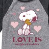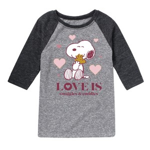 Peanuts - Love Is Snuggles And Cuddles - Toddler And Youth Raglan Graphic T-Shirt - From the best-loved comic strip in history comes officially licensed PEANUTS apparel for fans everywhere. Show your love for Charlie Brown, Snoopy, Woodstock, Lucy, Linus, Pigpen and the whole gang. Copyright Peanuts.