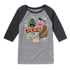 Star Wars - Chewie Stickers - Toddler And Youth Raglan - Embark on an epic adventure with our officially licensed Star Wars graphic apparel collection! Celebrate the legendary saga with bold, iconic designs featuring your favorite characters, ships, and moments from a galaxy far, far away. Whether it's the fearless Luke Skywalker, the powerful Darth Vader, the wise Yoda, or the unforgettable Millennium Falcon, each piece captures the magic and excitement of the Star Wars universe. From graphic tees and hoodies to sweatshirts, this collection combines comfort with striking artwork that showcases the timeless appeal of the Star Wars story.