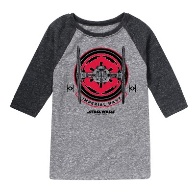 Star Wars - Imperial Navy Flight Patch - Toddler And Youth Raglan - Embark on an epic adventure with our officially licensed Star Wars graphic apparel collection! Celebrate the legendary saga with bold, iconic designs featuring your favorite characters, ships, and moments from a galaxy far, far away. Whether it's the fearless Luke Skywalker, the powerful Darth Vader, the wise Yoda, or the unforgettable Millennium Falcon, each piece captures the magic and excitement of the Star Wars universe. From graphic tees and hoodies to sweatshirts, this collection combines comfort with striking artwork that showcases the timeless appeal of the Star Wars story.