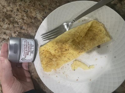 - Everything But The Eggs & Omelette Breakfast Seasoning: Sea Salt, Sesame Seed, Basil, Garlic, Onion, Parsley, Cane Sugar, Celery Seed, Paprika, Oregano, Lemon Peel Powder, Thyme, Dill Tips, Red Pepper, White Cheddar Cheese (Milk, Salt, Cultures & Enzymes), Butter (Sweet Cream, Salt, Annatto Color, Non Fat Milk Solids) , Jalapeno), Chives, Basil Leaves, Chervil, Tarragon, White Pepper.