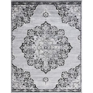 The transitional style of this rug offers a versatile design that harmoniously intertwines with both contemporary and traditional decor, creating a timeless aesthetic. As depicted in the provided image, the rug showcases an array of grey and black hues, featuring an intricate pattern that exudes an aura of classic charm with a modern twist.