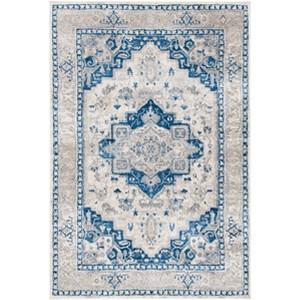 Introducing our exquisite 5'-3" X 7'-6" medium rectangle area rug, a true testament to transitional style and artisanal craftsmanship. Expertly power-loomed in Turkey, this rug showcases a mesmerizing pattern of intricacy and depth in soothing shades of ivory and blue, enveloping any room with a serene and elegant ambiance.