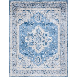The rug boasts a beautiful pattern showcasing intricate designs in calming shades of blue and grey, creating a serene yet sophisticated aesthetic. The detailed motif displayed in the image speaks to the rug's timeless charm, perfectly suited for a variety of decor styles from classic to contemporary.