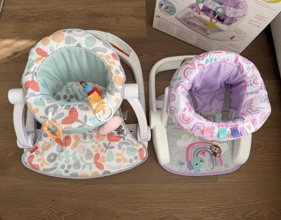 I bought this and the Fisher-Price Sit-Me-up Floor Seat Portable Baby Infant Chair to compare the two. The bright starts is much more compact which is nice but way less sturdy. I only like it for the reason it gives a little more room for baby to kick legs around in the more upright position. They are both the same height. Only difference is the seat on fisher price is lower to ground Seems like baby could lean and tip this easily though (it’s much narrower than fisher price). Other than the perk of feet moving around more I like the fisher price for overall quality.