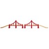 The 33683 Double Suspension Bridge is the longest bridge in the BRIO World railway system measuring 1134mm. It stands high enough for trains, boats and other vehicles to pass underneath it and offers extreme stability thanks to the wide integral bridge supports. Add two ascending tracks to the bridge to create two smaller bridges or try a different connecting track in the middle of the bridges to create new designs. This vibrant red railway bridge is a brilliant addition to any wooden train set.