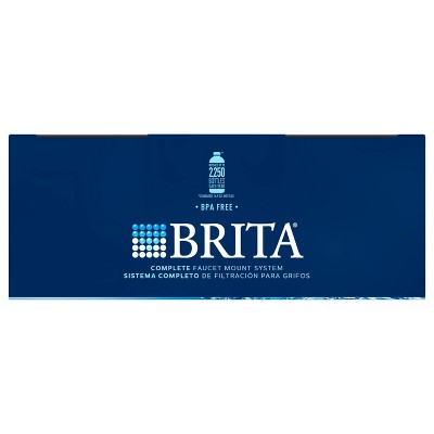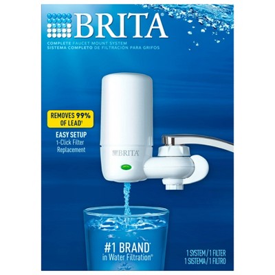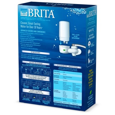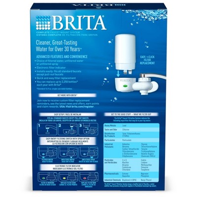 This complete Brita® faucet water filter attaches to your standard faucet making tap water cleaner* and great-tasting; Filtration system is easy to install; no tools requiredGet great-tasting water without the waste; by switching to Brita®, you can save money and replace 1800 single-use water bottles** per yearThe space efficient design attaches directly to your faucet to give you a choice of 3 convenient spray options for everyday needs – filtered water, unfiltered water and unfiltered spray; Available in white and includes an electronic filter indicator for easy replacement reminders; Height 4.86"; Width 4.69"; Depth 2.26"; Weight .84 poundsReduce 99% of lead, chlorine (taste and odor), asbestos, particulates, Benzene, and more; a helpful status indicator lets you know when to replace the filter with an easy 1-click filter replacementReplace your faucet mount water filter every 100 gallons or approximately every 4 months to keep water tasting great; this tap water filter fits standard faucets only, does not fit pull-out or spray style faucets; *vs tap; **16.9 oz water bottle
