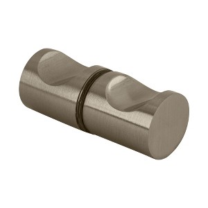 The Back To Back E Z Grip Style Shower Door Knobs feature a 1" diameter and a 1-1/8" projection from the glass surface. Made of brass material with a brushed nickel finish, these knobs are designed for through-glass installation using a 1/2" hole. The concave grip design provides a safe hold, suitable for various frameless enclosures. Compatible with 1/4" to 1/2" (6 to 12mm) monolithic tempered glass panels and supports sliding, folding, swinging, and pivoting doors in corner, niche, bathtub, or custom-built glass shower setups.