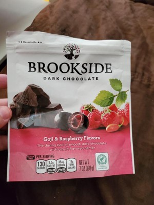 - Contains one (1) 7-ounce resealable bag of BROOKSIDE Dark Chocolate with Goji and Raspberry Flavored Centers Snacking Chocolate