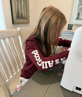 My grandma bought me this machine for Christmas and I love it. I’m 8. She bought this particular machine because it supposedly came with a hard case for bringing it to her house, and my foot can’t reach the foot pedal so I needed the speed slider and buttons on the front of the machine to operate it. I learned all the parts including how to thread it and install the bobbin. I made my first pillowcase and two pencil bags. Next I’m making an apron for my mom. It’s too bad that I have to leave it at my grandma’s until she gets me a new case. She’s afraid the machine will fall out of the bottom if I carry it. It has no bottom like her case has.