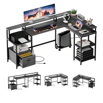 - Enhance your workspace with our large computer desk, designed for both gaming and work. This versatile desk features a built-in charging station, providing four power outlets, two USB ports, and one Type C port, ensuring everything is powered and organized. Whether you need a desk l-shaped for a corner or a straight line setup for smaller spaces, this desk fits perfectly.Key Features:Built-in Charging Station: Keep all your devices powered and organized with four power outlets, two USB ports, and one Type C port.Flexible Setup: The desk adapts to any room size with ease, offering configurations in an L-shape, straight line, or left/right-handed setup.Ample Storage: Includes a sturdy wooden file cabinet with adjustable shelves and a mobile CPU stand, providing a versatile workspace with drawers and additional storage solutions.Ergonomic Design: Features dual monitor stands that raise your screens to the ideal viewing height, reducing neck strain and enhancing comfort during long gaming or work sessions.Spacious and Stylish: With a steel frame and a chic wooden desktop available in Rustic Brown or Rustic Gray, this l-shaped computer desk offers 67 inches of workspace, making it perfect for multiple monitors and all your office or gaming essentials.Elegant Touch: This desk is more than just functional; it adds a stylish touch to any room, blending seamlessly with your décor.Benefits:Convenience: The built-in charging station ensures everything is powered and ready for your gaming or work sessions.Customization: The desk can be arranged in an L-shape, straight line, or left/right-handed setup to suit your needs.Space Efficient: The ample storage solutions help keep your workspace tidy and within reach, freeing up more space for you to work efficiently.Comfort: The ergonomic design of the gaming computer desk promotes better posture and overall well-being during long gaming or work sessions.Upgrade your workspace with this stylish and functional computer desk, designed to meet all your computing and office needs.