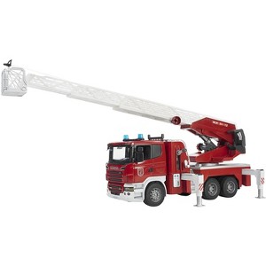What could be more exciting than playing firemen? The newest vehicle in the BRUDER fire brigade range is the MACK Granite Fire engine with telescoping ladder equipped with a lights and sounds module that takes 2 AAA, batteries (included). As well as many small details such as opening doors, mirrors that fold back, opening hood and lots of chrome parts, the vehicle has an integrated water tank that can be easily filled. This allows the water hose to actually shoot water. The water hose can be wound up, held by BRUDER figures (e. g. art. no. 60000 not supplied), or secured to the basket. It also has a fully functioning nozzle. The turntable ladder with rescue basket can be extended by a hand-wheel and adjusted in height. The cab has two seats and there is another seat for a BRUDER figure on the ladder. Four extendible support legs ensure vehicle stability in any situation and a large storage compartment with a door which folds up means there is extra space for storing tools. The many functions and details allow limitless creative games.