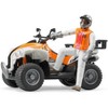 Quads are not only named for having four tires but for their versatility to ride almost anywhere. They can go on road, dirt, sand, and even water if it is low enough! Go ahead and strike the adventurous side of your child with the Bruder Quad with driver. Quads are used in many different aspects of life; whether it be work or play, they get the job done with astonishing results. Kick up the sand in the desert with the all-terrain soft tires, pull a trailer full of lumber with the strong motor, or climb a mountain with the 4X4 capability these machines offer. There is no wonder they are for commercial or recreational use or both! The suspension of both axles makes the quad versatile which allows for accurate turning and maneuverability in moderate to difficult environments. The bworld figurine, with matching protective gear, makes for a more realistic off-road experience while sitting on the optimized seat.