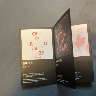 quality packaging, firm structure of compact cardboard presentation. photocard, postcard, accordion mini booklet of BTS albums, thick photobook with lyrics. very nice, worth the price!!!