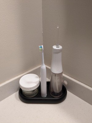 I'm super pleased with this tray. It has a clean, simple design that mimics the look of a ceramic tray. I love that the bottom of the tray has both raised feet and rubber protectors on the bottom of those feet so your surface is protected and any moisture that gets around the tray will have a chance to dry. The lip keeps any moisture in the tray but also reduces the space inside to about 7 3/4" by 3 3/4." It's a hair small for the ultrasonic cleaner I had planned to set on it but a good fit for our other oral care items, oil sprayers in the kitchen, and soap dispensers. It's a nice tray that could have many potential uses in the home.