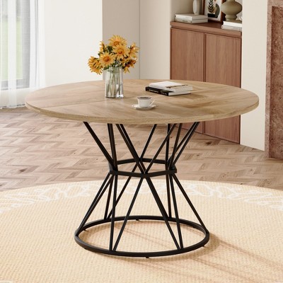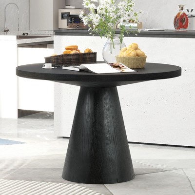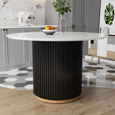 This classic round table features a genuine marble top and elegantly contrasts with the dark base, crafted from solid wood and finished in a distressed antique black. The pedestal boasts carved wood detailing supported on a wide bracket footed base. This Rustic inspired dining table, with its two-tone design, will lend itself well to any number of decor styles, and bring a vintage look to any dining space.