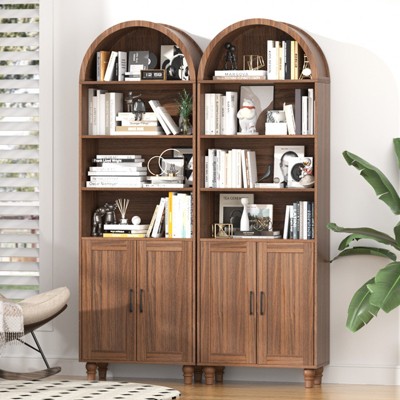 Add rustic charm to your home with the Buenhomino 71" Tall Arched Cabinet! This elegant arched bookshelf/bookcase blends farmhouse style with modern function, featuring 6 tiers of storage¡ªincluding adjustable shelves and doors¡ªperfect for displaying books, dishes, or d¨¦cor. Made from sturdy MDF with a natural walnut wood finish, it fits beautifully in living rooms, kitchens, or offices. Easy to assemble and includes an anti-tip kit for safety.