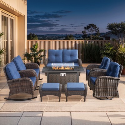 - 【7-PIECE OUTDOOR FURNITURE SET】 Create the perfect outdoor living space with this complete 7 pieces patio furniture sets with fire pit table. The ensemble includes two comfortable armchairs, a unique gliding loveseat, two matching ottomans, a handy side table, and a multi-functional 43-inch fire pit table. This 7pcs outdoor wicker conversation set provides everything you need for stylish relaxation and entertaining in your garden, patio, or by the poolside.