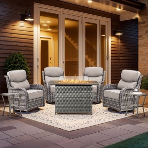 - 7pcs Outdoor Furniture with Fire Pit Table -This outdoor conversation set includes four swivel rocker chairs, two tempered glass side tables, and a 41" rectangular fire pit table, providing a stylish solution for furnishing your outdoor living area.