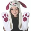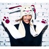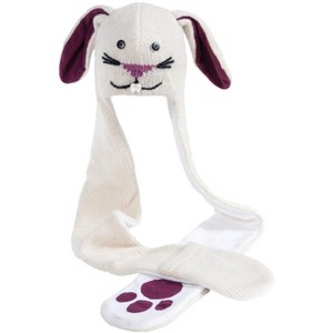 The Bunny Hatscarf is hand-knit from 100% wool and is lined with soft Polyester fleece. It features long scarf panels with pockets to cover you from head to paw!