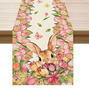 Bunny Tulips Flowers Rabbits Easter Table Runner Table Decoration for Party Home Kitchen Dining Holiday Decor 13x72 Inch