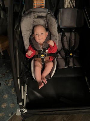 Material is soft and keeps my baby all snuggled inside. Helps a lot when on the road and baby is not bouncing around. Easily put seat in and there is still room for my toddler to sit too.
