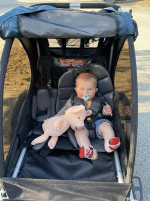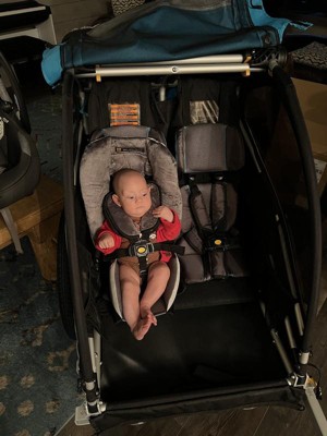 Quality materials. It seems comfy for my baby. I have twins, so we have the double trailer. One complaint is that the seat doesn’t seem to be very snugly secure in the larger seat apparatus, it’s mostly held in place by Velcro. It would be nice if there were more straps to secure it along with the Velcro. One use down, so far so good! Can’t wait to use it for more active things! So far we’ve just used it to stroll about but looking forward to jogging with it, and when they’re a bit older using it with the bike!