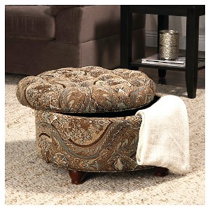 This round storage ottoman offers timeless style in a modern brown and blue paisley pattern. With wood legs in a light cherry finish and button tufting on top, this plush tufted ottoman creates impact in any space. Use it in the living room or family room to contain controllers, remotes or toys or place it in a bedroom to hide pillows or throws. This elegant multi-tasking storage ottoman can also provide extra seating or serve as an ottoman coffee table. The lift-off lid enables quick access to storage within. Easy to assemble and maintain. Please note that fabric and wood colors may appear slightly different due to variations in lighting or screen settings.
