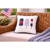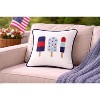 Embroidered cotton blend accent pillow with three patriotic popsicle motifs in red, white, and navy on white, finished with navy piping. Measures 10x10 inches. A playful Fourth of July and Americana accent for summer layering and display.