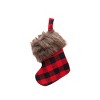 - Hand crafted stocking in a rustic red and black buffalo check with faux fur trim