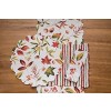 The Camilla tabletop collection creates a warm, inviting fall dining table with its vibrant jewel tones of red, green, and amber. A fall foliage motif of maple leaves and acorns fall against a white ground. Reverse to a painterly striped pattern to build a cozy mood no matter the season.