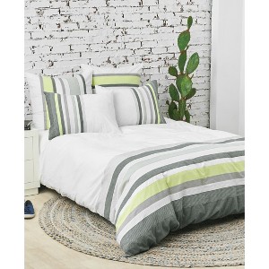 The boulder and indigo stripe design on this 100% cotton duvet cover gives any bedroom a cool and modern feel. With a vibrant citron green accent stripe, the Jones duvet cover brings trending color to the look while still maintaining a relaxed vibe. Finished with a hidden button closure and interior ties.