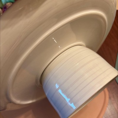 I adore this dessert stand! It’s functional and has a good weight to it. Wanted to share a picture though since there is a pink swirl in the plate that I wasn’t expecting since the item on target shows it as only white background. I don’t mind and actually love the pink in it.