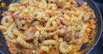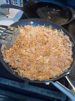 [This review was collected as part of a promotion.] I am in loooove with this set of Calphalon cookware! I had stepped away from non stick for a long time because it scratched so easily and didn't cook evenly. But I was thrilled to see that this ain't your everyday non stick finish! It can still scratch, but not nearly as easily. And let me tell you, clean up is a breeze! Everything I have cooked in it, even this pasta dish from start to finish, just wiped right out when I was finished! I had been using ceramic for a while, but I realized after using this set how much better this type of pan browns meats and vegetables. It just cooks more evenly, and things come out better..I appreciate they are a good weight and sturdy, but not overly heavy like some pans can be. I definitely have a new favorite set of cookware and reach for these beautiful pieces far more than any others now!
