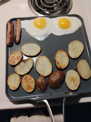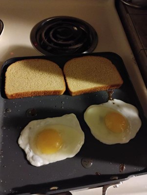 [This review was collected as part of a promotion.] This griddle is great for making eggs and grilled cheese. The ceramic makes it easy to flip. The heat is distributed evenly on the griddle. I will look into other products from this brand.