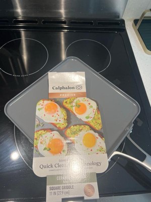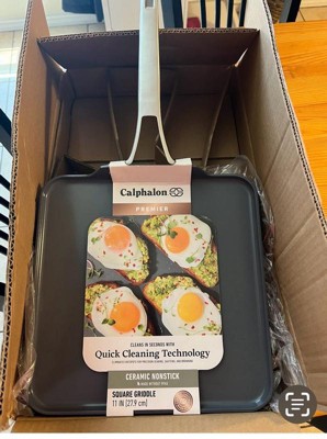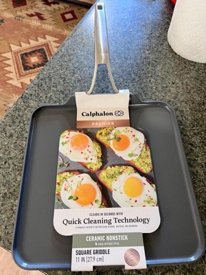 [This review was collected as part of a promotion.] Calphalon Premier Ceramic Square Griddle in Midnight Blue is pretty big—11 inches. Great for reheating my pizza or making eggs. This dish is a breeze to clean up, it is truly nonstick. Just add water & a little soap & put it away. I haven’t had a Calphalon product in a while & I was pleasantly surprised.