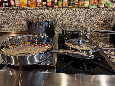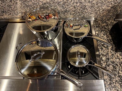 [This review was collected as part of a promotion.] This pan set is very nice looking and sleek with its rounded edges and perfect fitting lids. They really do heat up faster than any set I’ve had. The handles actually do stay cool too! They clean easily and food doesn’t seem to stick to them like most stainless steel sets. It’s definitely a wonderful set and my husband and I both love cooking with them.