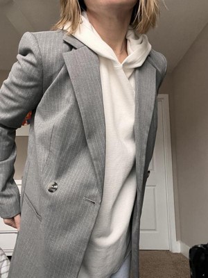 [This review was collected as part of a promotion.] I am absolutely in love with my new blazer from Calvin Klein! The timeless pinstripes and double-breasted design complement any outfit. I love how versatile it is – whether I'm wearing it with a hooded t-shirt and jeans or changing it up with a classic dress, this blazer effortlessly elevates my wardrobe. I also style it with a thin sweater it fits well underneath, but if the sweater is bulky it is too tight in sleeves. I am a 5"2 XS, the fit is fantastic, and the quality speaks volumes. It's a true classic!