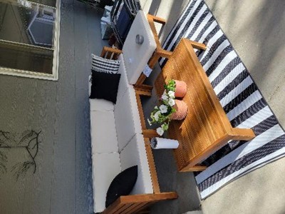 Cozy stylish. Took a bit but super easy to put together. Low profile creates cozy; loungey feel. Love the teak look. Get so many compliments! Cushions are easy to brush off when wet / dirty. Great value for price.