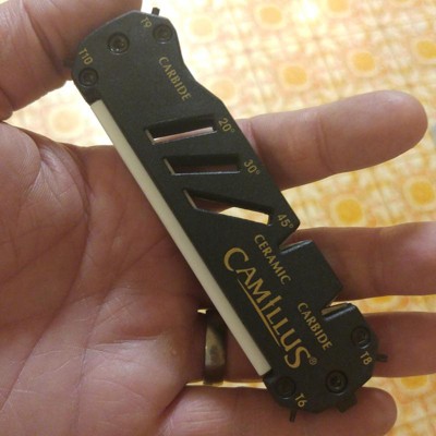 [This review was collected as part of a promotion.] This Camillus sharpener is convenient and provides a nice edge on my knives. I keep it in my tackle box, but pull it out for our carving set and tools as needed.