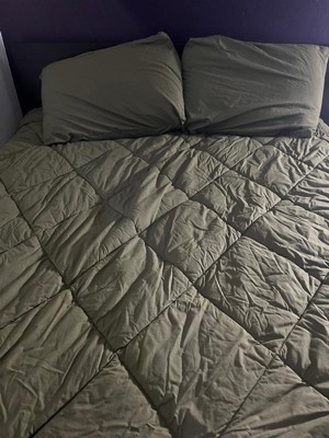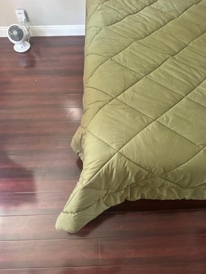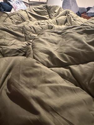 [This review was collected as part of a promotion.] This comforter has a nice feel to it. It's not too thick or too thin. I like this olive green color for my basic room. It included the comfort and two standard shams.