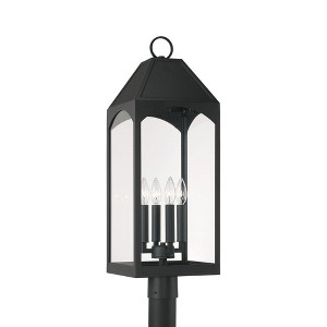 Enhance your exterior with the Burton Post Lantern. The arched panes and tented top in a Black finish beautifully blend classic style with modern appeal. Designed to fit our Post or Pier Mount bases (sold separately). Part of ourRain or Shine Collection and backed by our five-year warranty. DIMENSIONS: Overall: 9.75"W x 28.75"H DETAILS: The tented top and arched panes paired with Clear Glass panels create a classic and clean look. Remove the screws on the bottom edge of the lantern to lift off for easy access to bulbs. FINISH: Part of the Rain or Shine series, the Black finish is a neutral, dark tone with a slightly coarse texture. BULBS: Designed to be dimmable and LED/CFL/Incandescent bulb compatible, this fixture uses 4 - 60 Watt (max) E12 Candelabra base bulbs (not included). It's shown here with a B10 lamp. FEATURES: Rated for Wet locations; includes a 5-Year Manufacturer Warranty Against Rust and Fading. Mounting Direction: Up Shade Included: Yes Shade Dimensions: 9 x 17.2