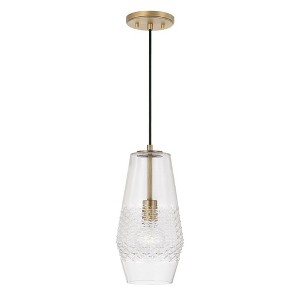 Reminiscent of heirloom glassware, the Dena Pendant brings a retrorevival to any space. The diamond embossed glass paired with Aged Brass gives a look that sparkles and shines. DIMENSIONS: Overall: 7"W x 14.25"H; Adjustable Hanging Height: 21" - 111"; Includes 96" of wire. DETAILS: The prism silhouette is accented by a diamond pattern embossed in clear glass; black braided cord. FINISH: Smooth to touch, the Aged Brass finish is a warm, honey-gold with subtle black undertones. The scouring technique creates a brushed visual texture and creates a refined, aged look. BULBS: Designed to be dimmable and LED/CFL/Incandescent bulb compatible, this fixture uses 1 - 100 Watt (max) E26 Medium base bulb (not included). It's shown here with a G25 lamp. FEATURES: Rated for dry locations; includes a 1-Year Manufacturer Warranty. Mounting Direction: Down Canopy Included: Yes Canopy Diameter: 5.00 Shade Included: Yes Shade Dimensions: 4.75 x 13.25