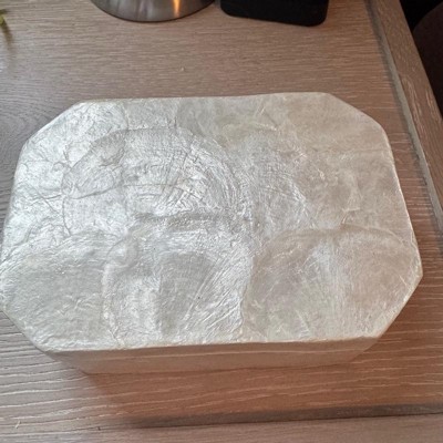 [This review was collected as part of a promotion.] This octagon-shaped Capiz decorative box is very shiny and pretty. It is delicate, with a tight-fitting lid, so it might be better for storage of items that you don't use on a daily basis or just use the box as a decorative item. The white mother-of-pearl color would especially look great with a cottage decor but is also neutral enough to fit in with any decor style.