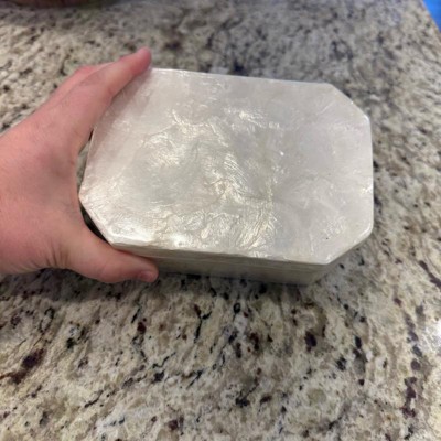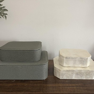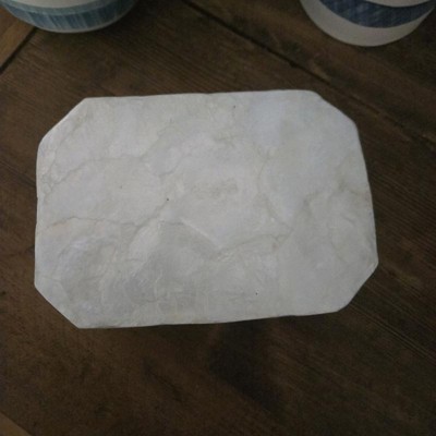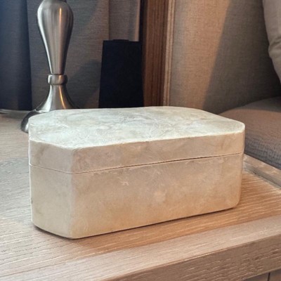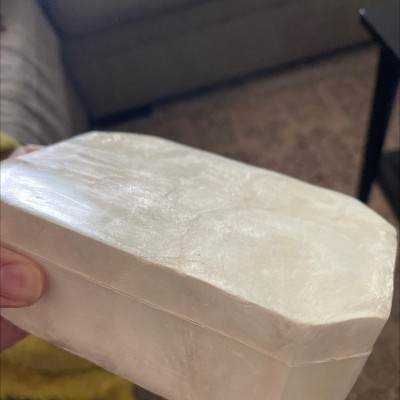 [This review was collected as part of a promotion.] I purchased this decorative little box online for my home. This white resin rectangle box looks like it is made from mother of pearl. It is opalescent and very shiny. Inside, the box is smooth and can hold any little trinket. This would make a great jewelry box. Currently, I am using it to hold all of our car keys when we walk into the house so they are all in one place. The box is pretty enough to be used just for decorating. It's about 3x6 inches and 4 inches deep. This was reasonably priced and I may also get the larger size to stack them together.
