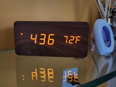 I really liked the look of this clock. Not big, matched my decor. The price didn’t break the bank. I also really like that you can dim the display, as I have a hard time sleeping if the room isn’t dark. Only problem was that the alarm didn’t actually work! I read the instructions for setting the alarm several times, but the alarm never sounded when it should have. The numbers on the display would blink/flash at the correct time, so I do think the alarm was set correctly….just glad I also set the alarm on my phone because this would have never woken me up for work!