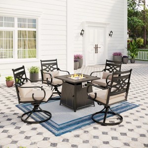 - Ultimate 5-Piece Patio Set: This square steel gas fire pit table ignites instantly, includes handy storage, and comes with 4 comfortable arm chairs. Perfect for dining, relaxing, and creating a cozy ambiance.