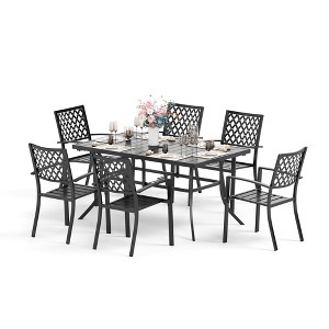 - Complete 7-Piece Dining Set: This versatile set includes a spacious dining table and six comfortable armrest metal chairs, offering ample seating for your outdoor gatherings.